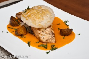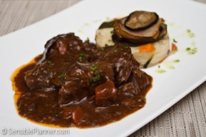 Main Course: Koulibiac of salmon with red bell pepper sauce or beef bourguignon with potato gratin