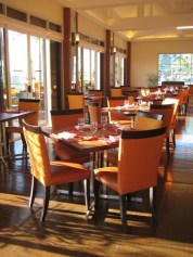 - It is well lit with nice ceiling, wooden tables and chairs.