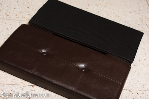 Best thing about it is that it provides 30 inch seating space (can sit a maximum of 2 adults) and more than 3 cubic feet of storage space. The dark brown faux-leather upholstery also matches the color of our shelves, cabinet and bed.