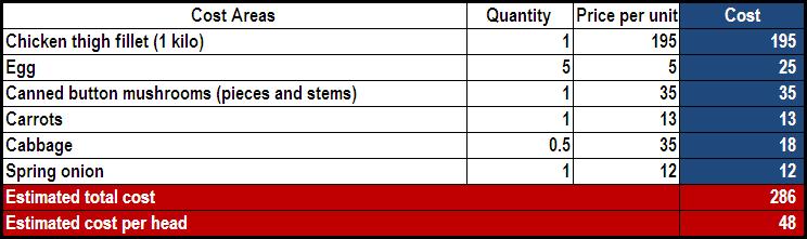 Estimated cost is for a 6 persons. Cost per head is approximately Php48/head.
