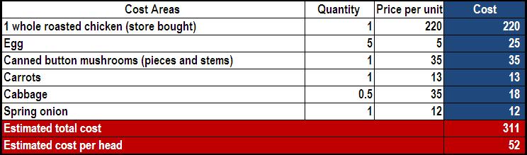 Estimated cost is for a 6 persons. Cost per head is approximately Php52/head.