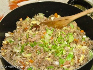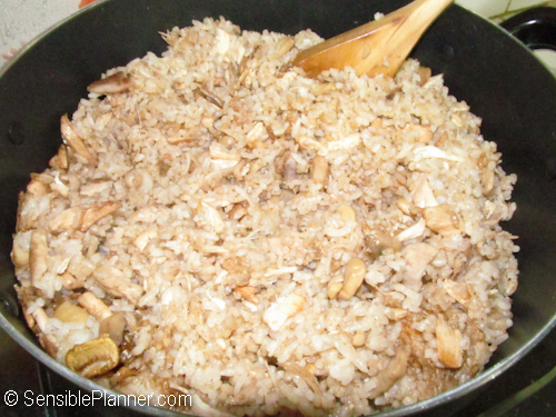 6. Put in rice and soy sauce. Mix well to ensure that the soy sauce is evenly distributed on the rice. (Suggested ratio of soy sauce to rice is 1:1, wherein you will put 1 tbsp. of soy sauce for every cup of rice to get a nice brown color.)